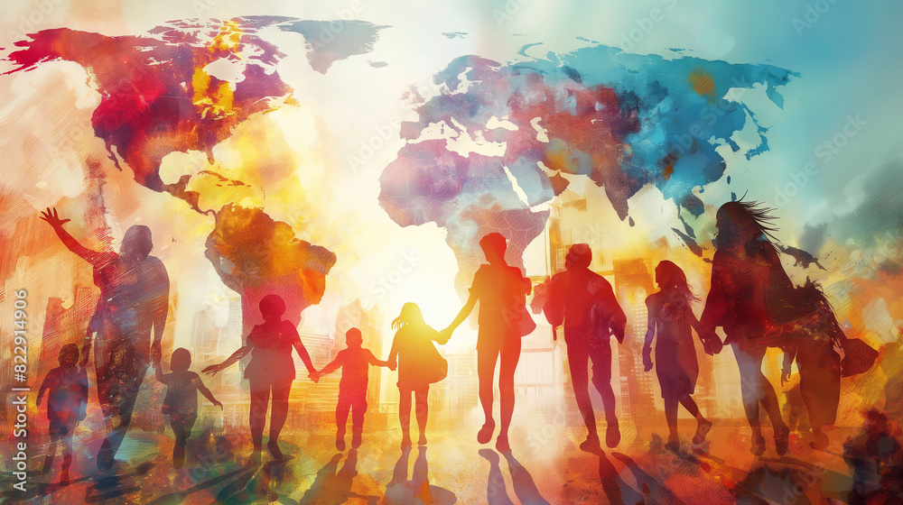 Internationaler Tag der Freundschaft am 30. Juli Menschen in einer Reihe viele Personen Hand in Hand als Silhouette vorm Sonnenuntergang Weltkarte im Hintergrund Generative AI #822914906