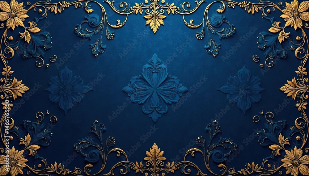Intricate floral damask pattern in elegant gold on deep blue background , blue, design #1465765950