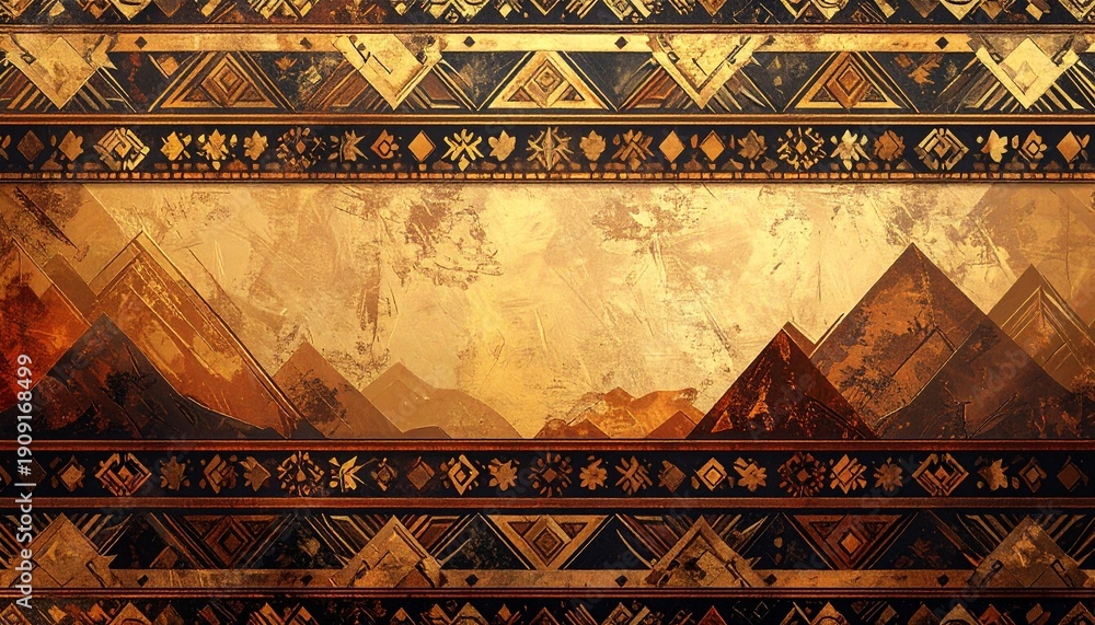 Intricate geometric ethnic patterns adorn the top and bottom borders of this warm, earthy-toned digital illustration, framing a stylized, textured mountain range against an abstract background. #1909168499