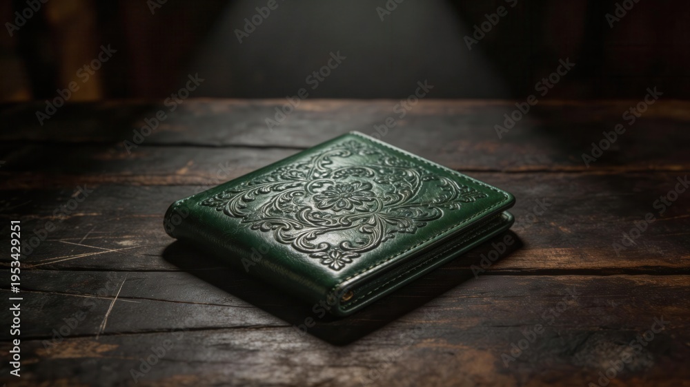 Intricate Leather Journal: A beautifully crafted green leather journal, with an intricate floral design, rests elegantly on a weathered wooden surface, under a subtle spotlight. #1953429251