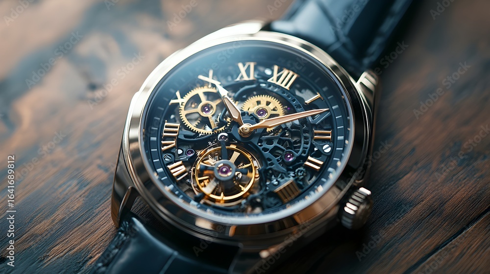 Intricate mechanical watch movement with roman numerals and leather strap #1641689812