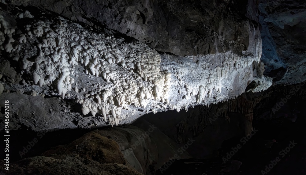 Intricate mineral deposits and stalactites forming within a dark, porous cave environment, showcasing geological wonders. #1945687018