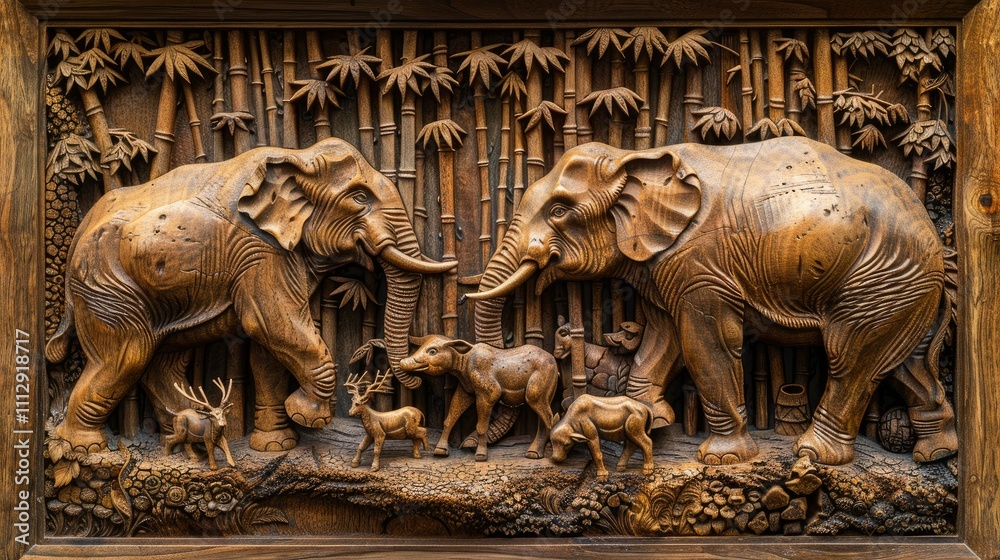 Intricate wooden carving depicting two elephants and other animals in a bamboo forest. #1112918717