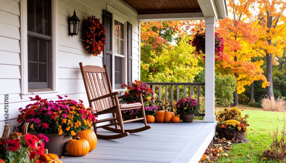 Inviting Porch with Wooden Rocking Chair and Colorful Fall Decor #1624751705