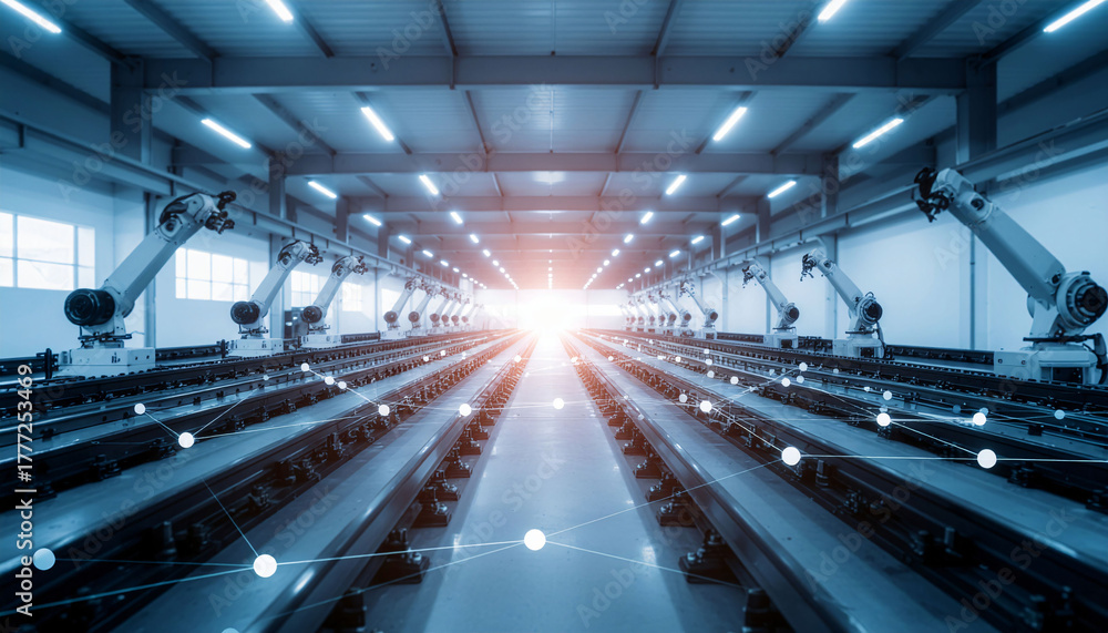 IoT and industrial automation visualization, factory robots connected by holographic network, AI-powered process monitoring. #1777253469