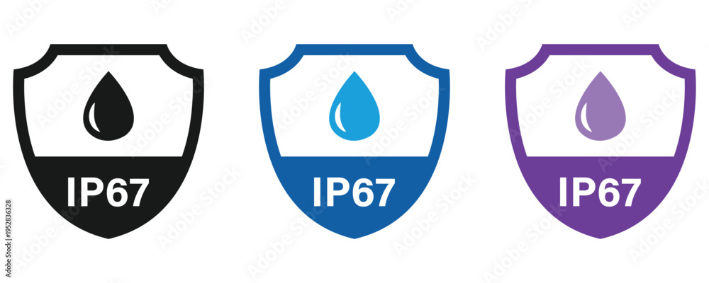 IP67 waterproof material badge label vector, IP67 waterproof rating, water protective capability icon label isolated on white background. #1952836328