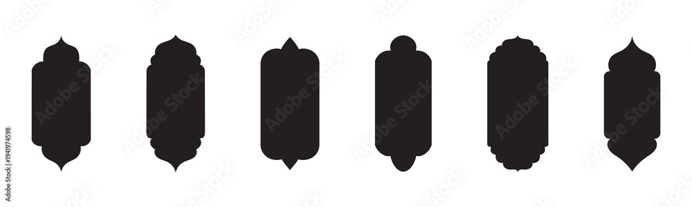 Islamic arch window frames set, pastel mihrab shapes, mosque niche silhouettes, decorative vector templates for Ramadan Eid design. Old islamic window shapes vector set in oriental style. #1941974598