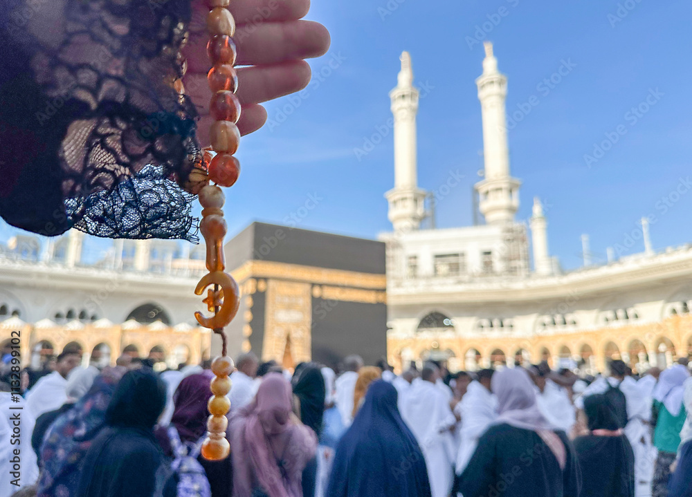 Islamic background with space for text. Muslim Rosary with a crescent moon in female hands of a pilgrim against the background of the Kaaba, the Sacred Mosque and pilgrims performing Hajj. #1132899102