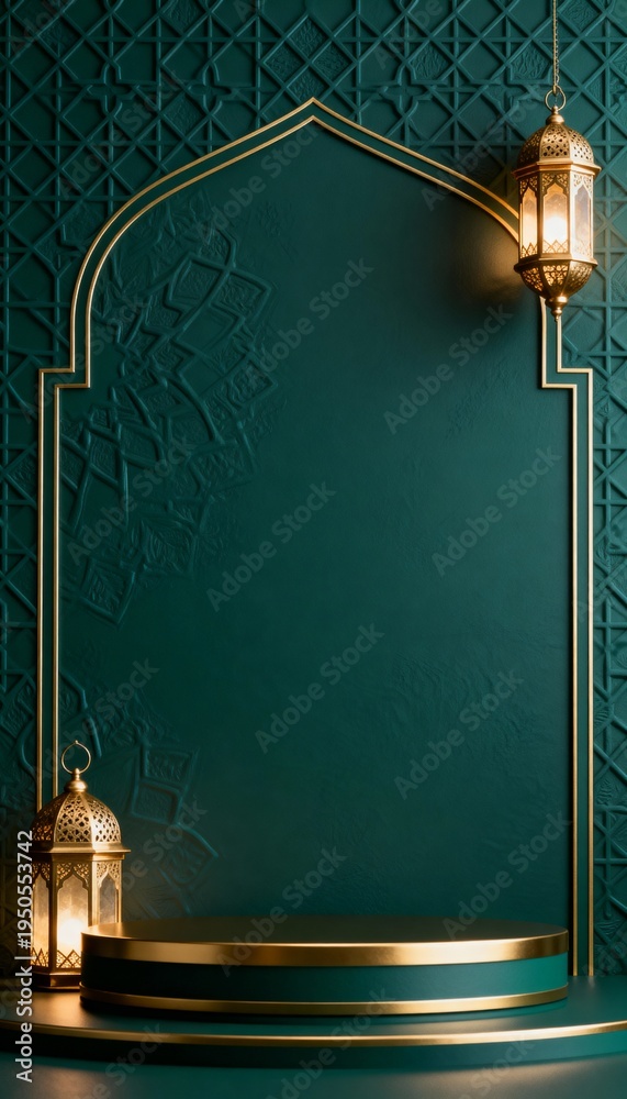 Islamic green background with gold lanterns and podium for product display. Ramadan Kareem and Eid Mubarak luxury greeting card concept. Vertical 3D illustration with copy space #1950553742