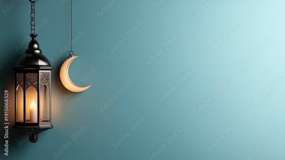 Islamic lantern and golden crescent moon hanging on a teal background, symbolizing Ramadan, Eid Mubarak, and other Muslim religious celebrations, providing copy space #1915068329