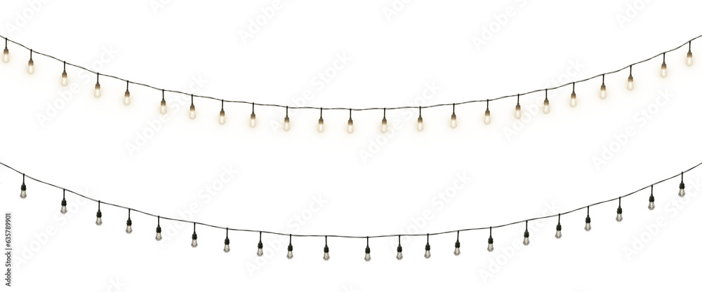 Isolated Christmas garland on a transparent background. Shining yellow light bulbs with sparkles. Suitable for Xmas, New Year, wedding, or birthday decorations. Perfect for party event decor. PNG #635789901