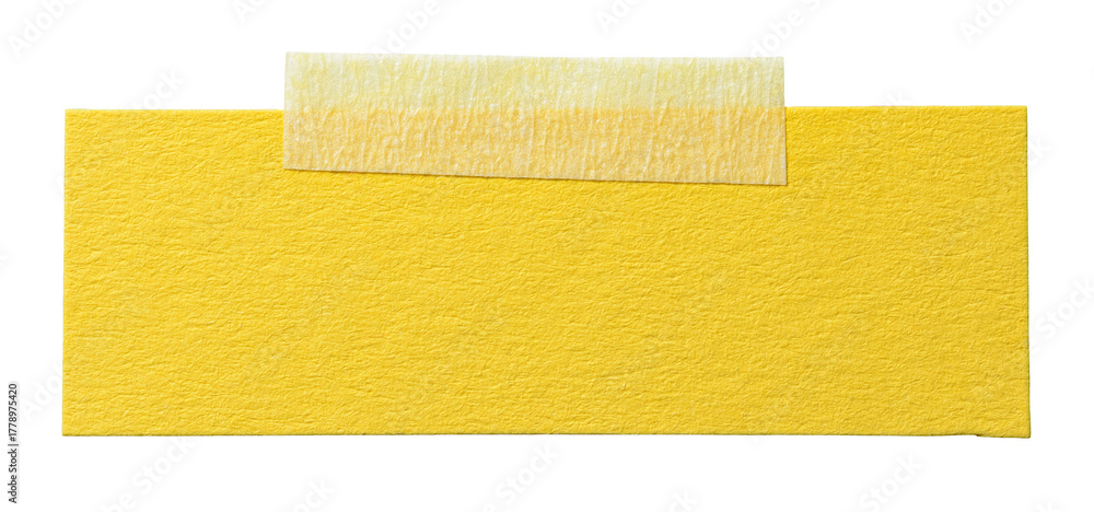 Isolated cut out piece of yellow paper note with rough texture and adhesive sticky tape with copy space for text, transparent png background design element #1778975420
