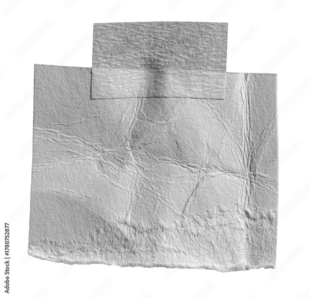 Isolated cut out torn piece of gray crumpled paper note with rough texture edges and adhesive sticky tape with copy space for text, transparent png background design element #1780752877