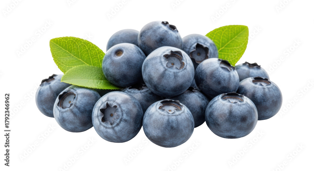 Isolated fresh pile of blueberries with leaves, delicious and healthy snack, food and fruit #1792346962