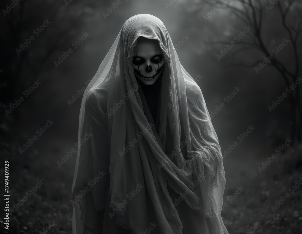 Isolated ghost figure with draped sheet halloween scary character in black and white style halloween costumes costume illustration holiday cartoon party zombie #1749401929