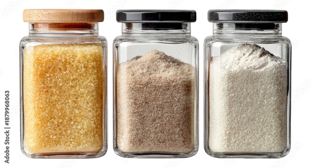 Isolated Glass Jars with Different Sugar Varieties on Transparent Background #1879968063