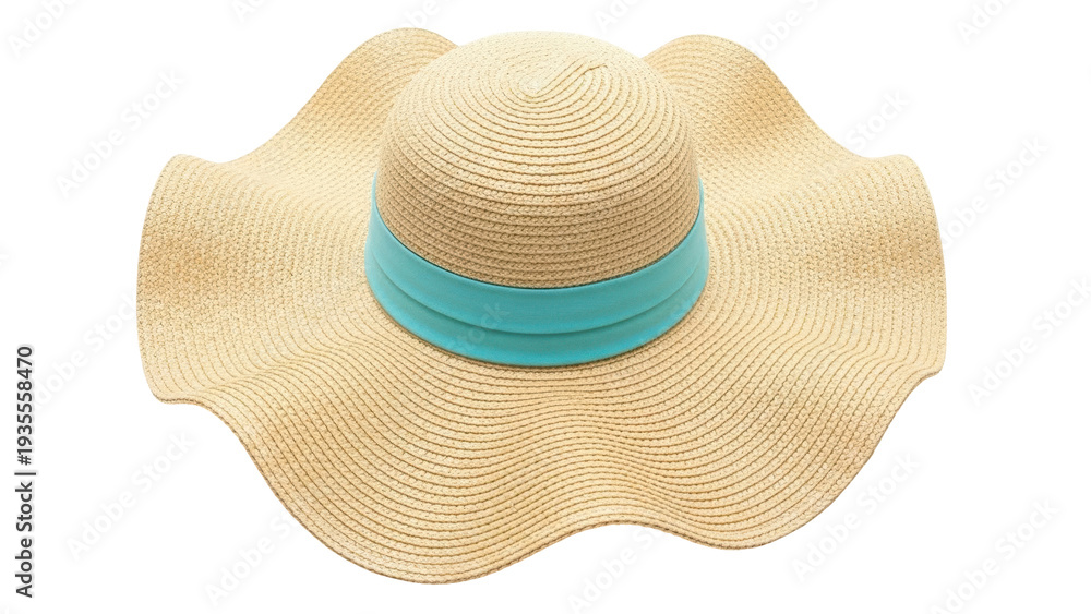 Isolated tan-colored sunhat with wide brim and blue ribbon, summer fashion accessory design #1935558470