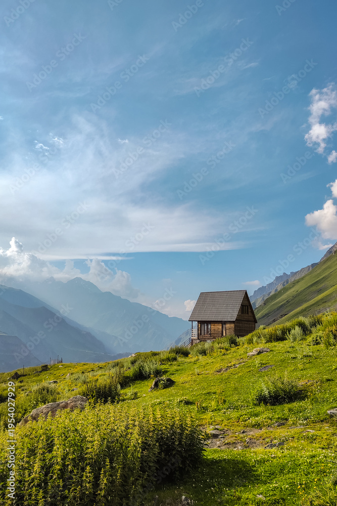 Isolated Wooden Cabin on a Lush Mountain Slope in Stepantsminda, Georgia #1954027929