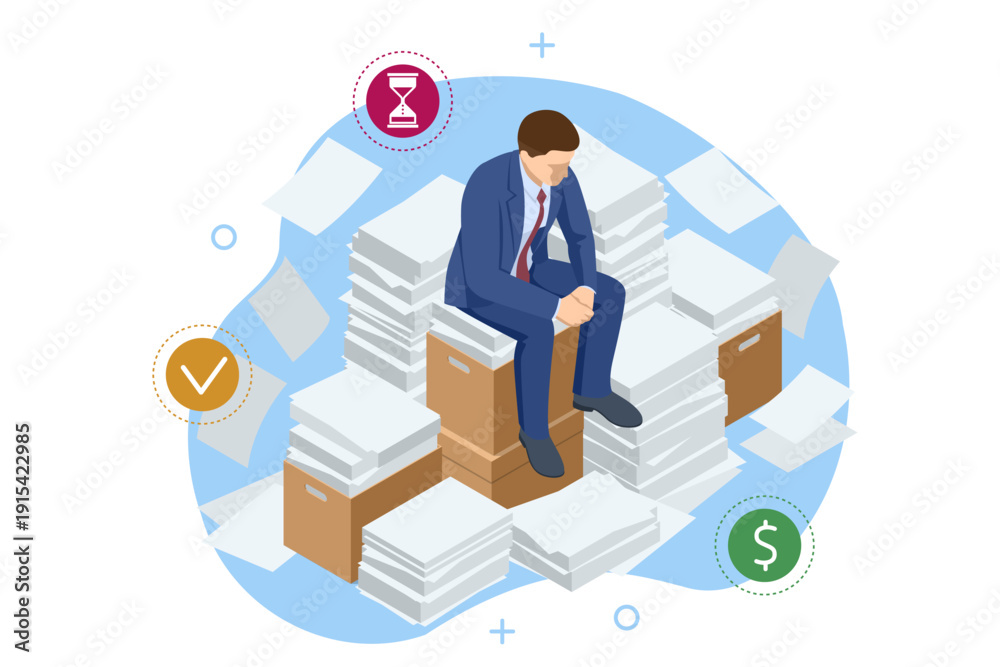 Isometric business deadline concept with stressed businessman sitting on archive box surrounded by document stack and hourglass. Time pressure, paperwork overload and finance control illustration. #1915422985