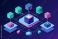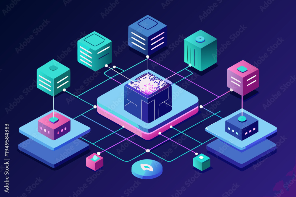 Isometric digital illustration depicts a centralized glowing data core connected by glowing lines to surrounding server blocks for decentralized network concept. #1949584363