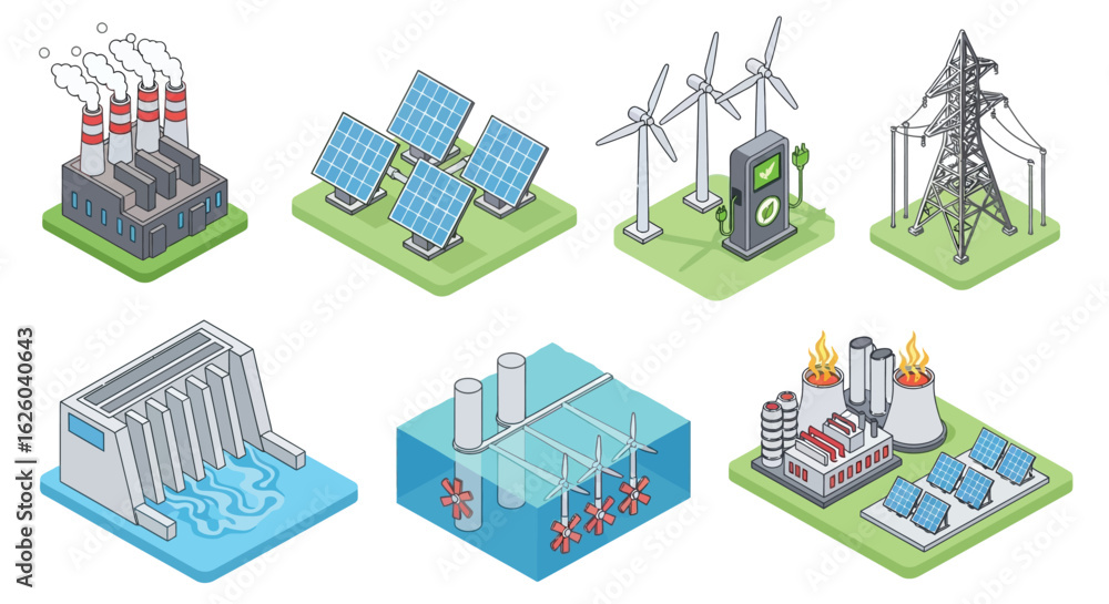 Isometric energy sources illustration showcasing renewable and nonrenewable power #1626040643