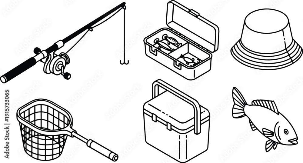 Isometric line art fishing gear set close up vector icons showing rod reel tackle box net hat cooler and fish #1915733065