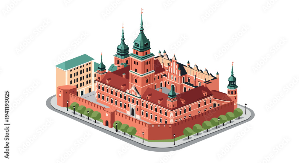 Isometric medieval castle with towers and walls in urban setting #1941193025