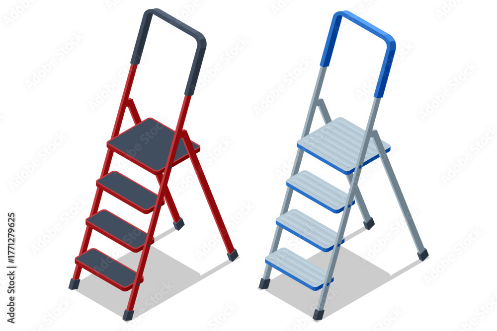 Isometric metal step ladders in red and blue colors. Concept of home repair, maintenance, construction, and DIY equipment. #1771279625