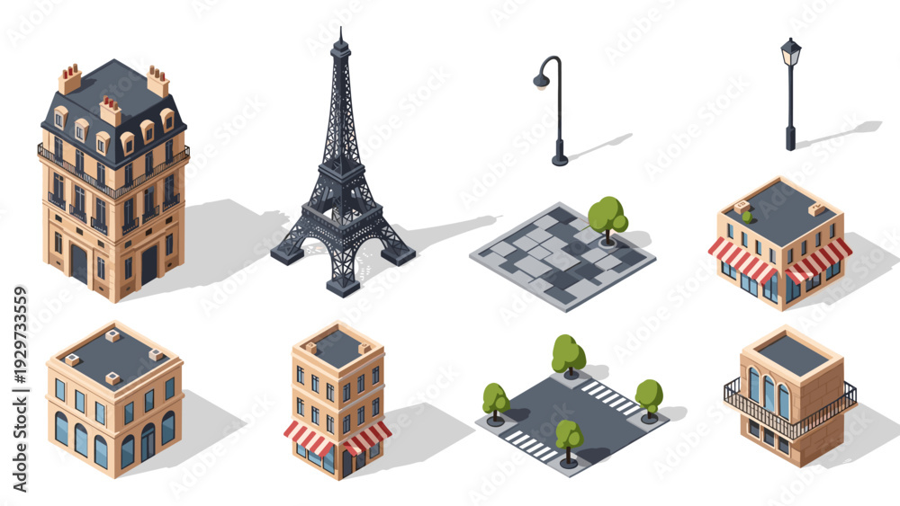 isometric paris city buildings eiffel tower and street elements set in flat style #1929733559