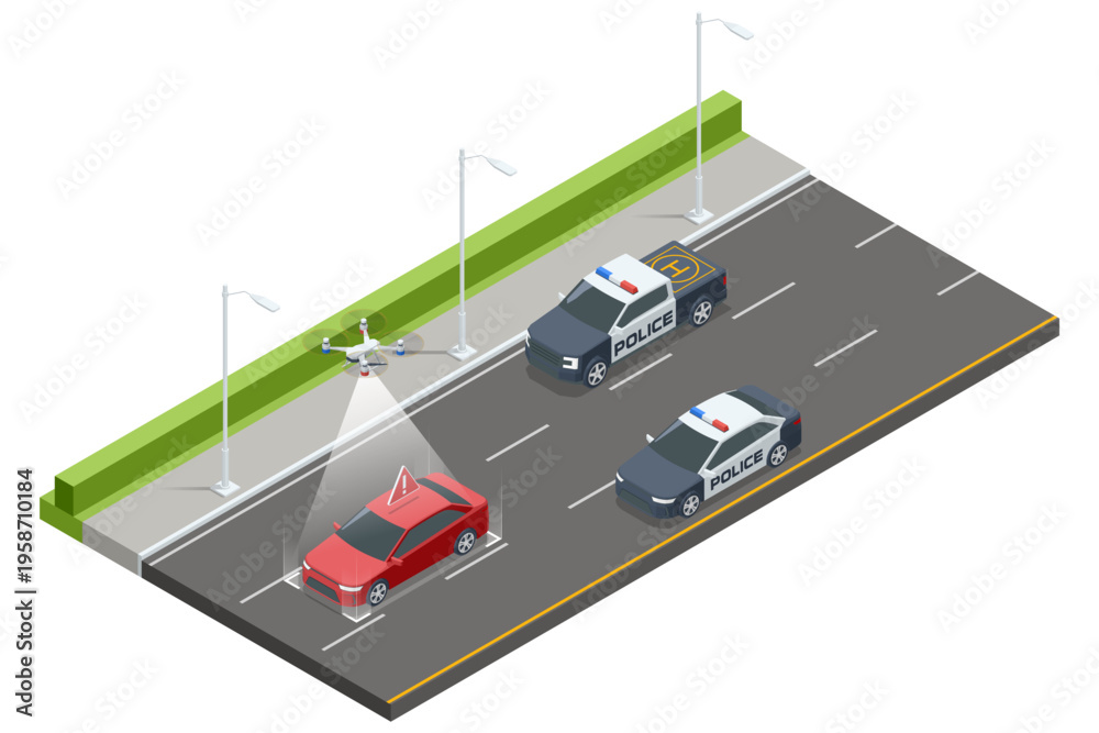 Isometric police vehicles using a quadcopter to monitor stopped car on multi lane road Aerial traffic enforcement, roadside inspection, law enforcement surveillance, safety control, incident response #1958710184