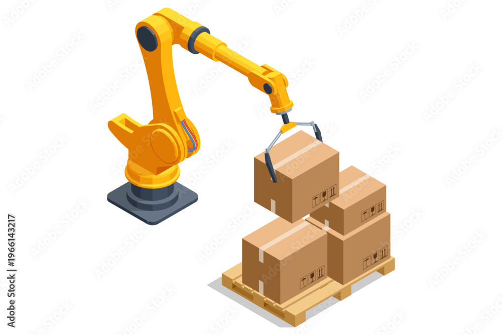 Isometric robotic arm lifts cardboard box onto a pallet in an automated warehouse. Industrial logistics concept shows package handling, smart storage, factory workflow and robotic distribution process #1966143217