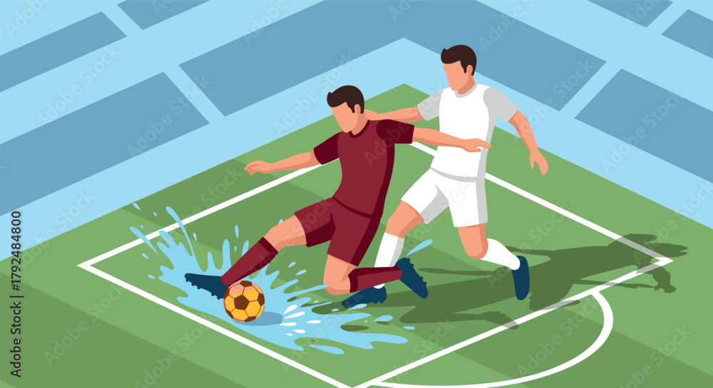 Isometric soccer players in action on a wet field in a stadium #1792484800