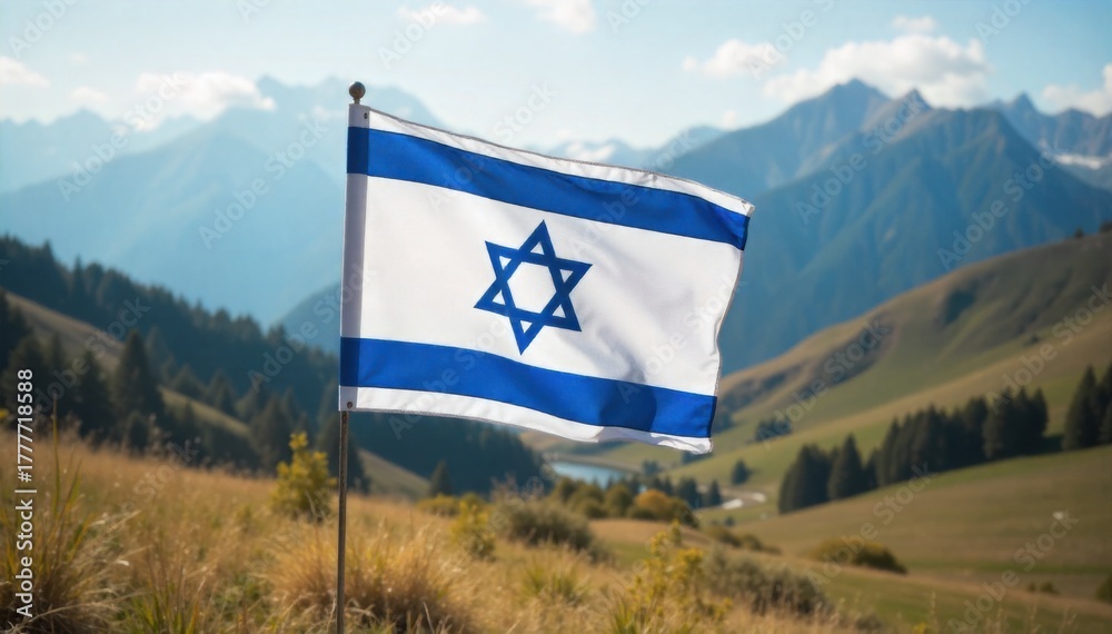Israeli Flag as a Landscape Element A subtle, abstract suggestion of the Israeli flag s blue and white stripes and Star of David incorporated into a natural landscape, like rock formations or cloud #1777718588