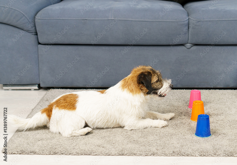 Jack Russell Terrier dog sniffing cones and preparing for scent in nose work competition. Intellectual games for dog training. #1389767722