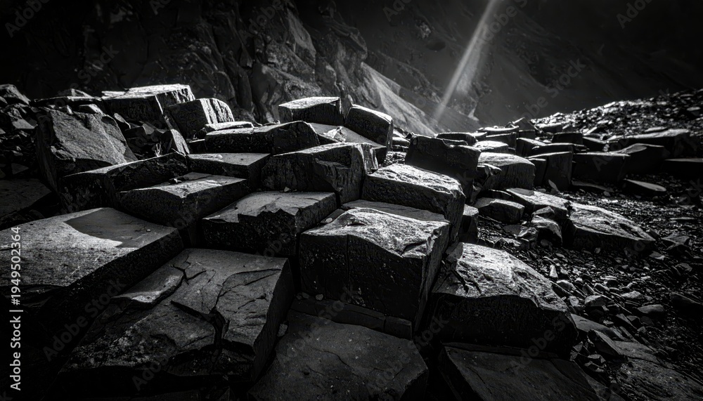 Jagged broken pieces of dark weathered stone forming a rough unforgiving natural texture outdoors #1949502364