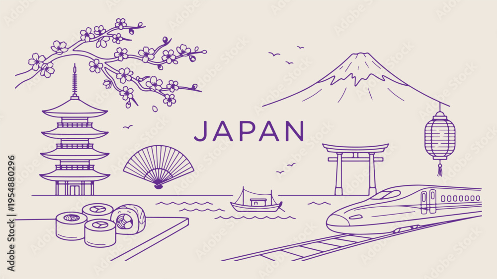 Japan cultural heritage, Mount Fuji illustration, Tokyo city landmarks, hand drawn Japanese icons, cherry blossom doodles, traditional Japan travel, oriental culture sketches #1954880296