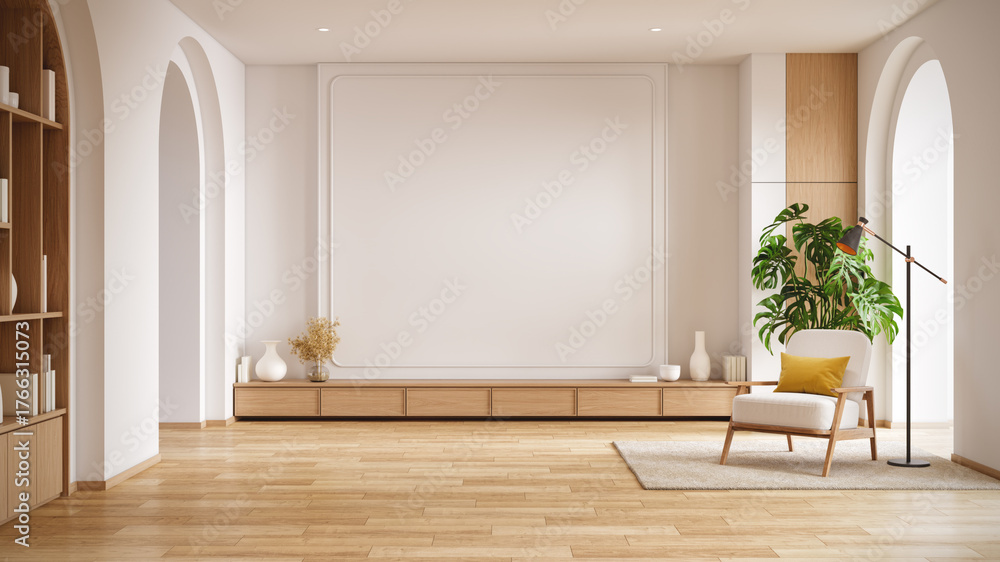 Japandi style and minimal living room with a modern armchair with wooden tv cabinet .3drender #1766315073