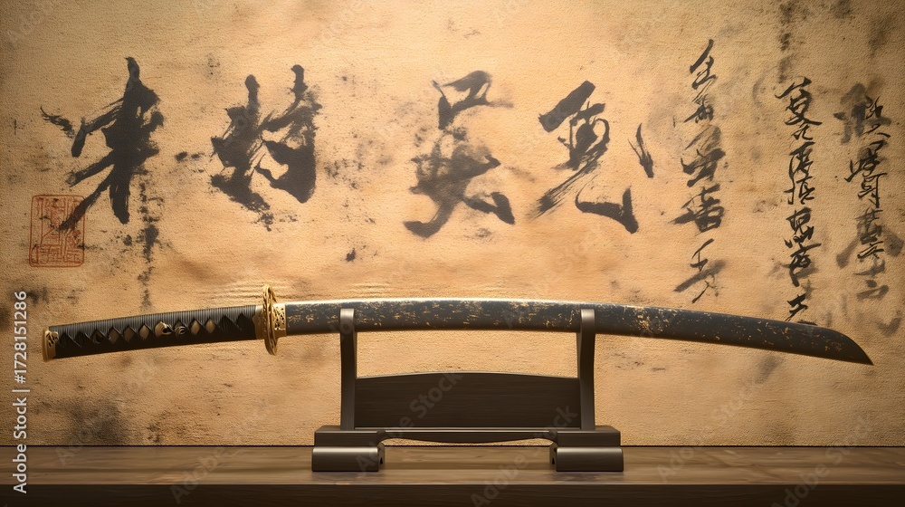 Japanese Katana Sword on Stand with Calligraphy Background #1728151286
