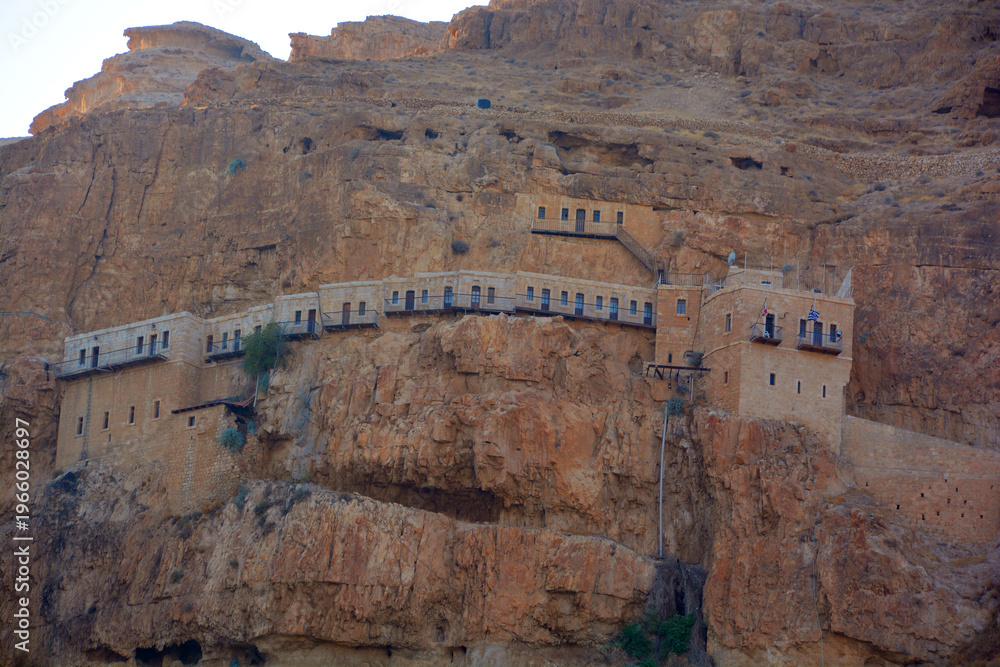 JERICHO ISRAEL: The Monastery of Saint George of Choziba is a Greek Orthodox monastery dramatically built into the cliff face of the Wadi Qelt, a scenic gorge between Jerusalem and Jericho. #1966028697