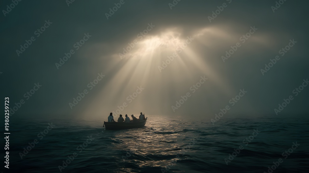Jesus centered in the boat as motion of the sea transitions toward stillness + surrounding environment shifting from chaos into calm horizon while disciples observe quietly + soft radiant light expand #1980259723