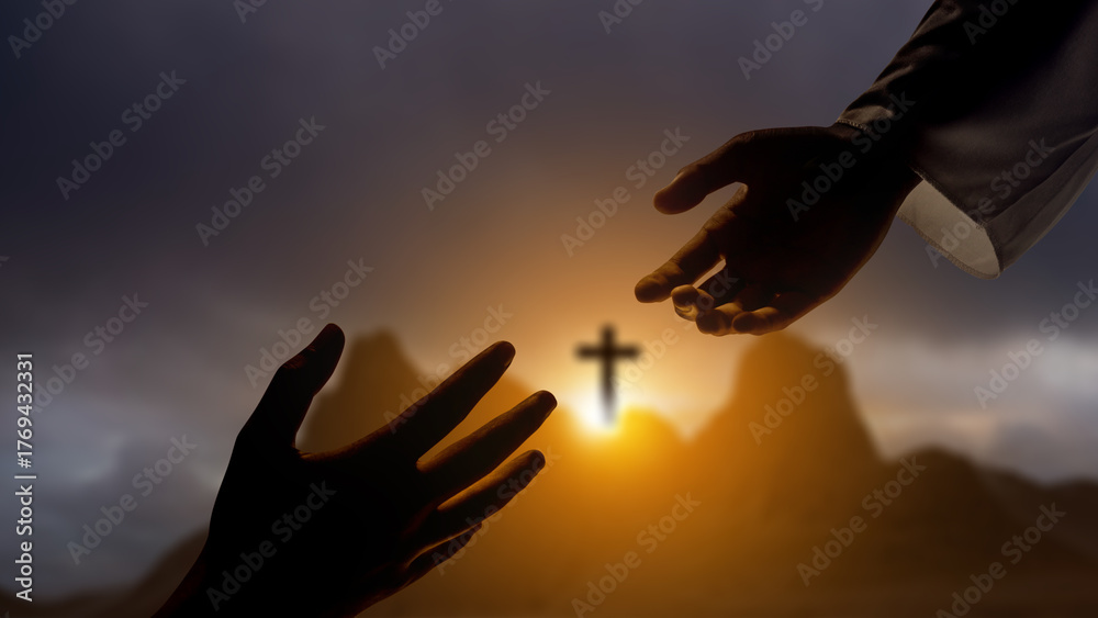 Jesus Christ hand offering a helping hand with Christian cross on the hill with dark dramatic sky background. Concept of Christianity, religious, faith, Jesus, or belief #1769432331