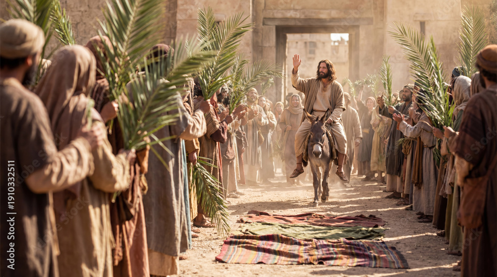 Jesus Christ riding a donkey during his triumphal entry into Jerusalem, with crowd waving palm branches for Palm Sunday. #1910332511