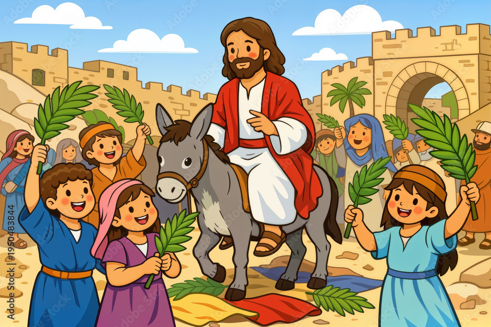 Jesus entering Jerusalem with children waving palm branches Palm Sunday educational illustration for children's Bible Sunday school youth religious education scene #1950483844