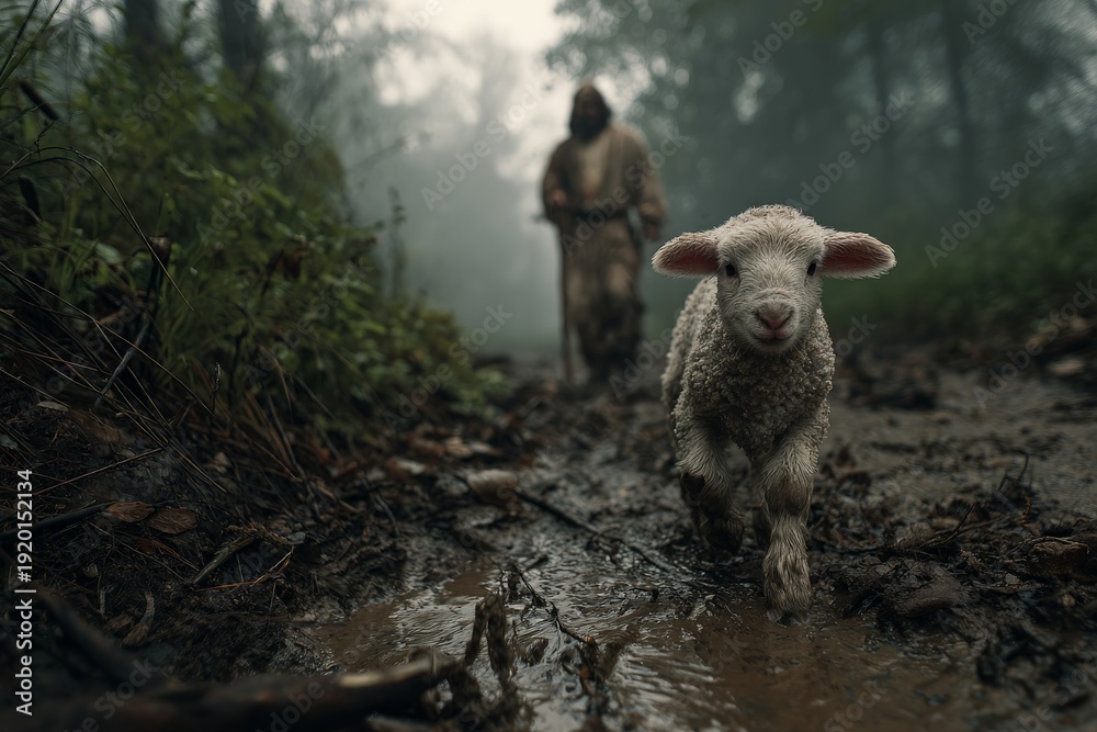 Jesus walkinh through a misty forest, approaching a baby lamb in the muddy morning landscape. #1920152134