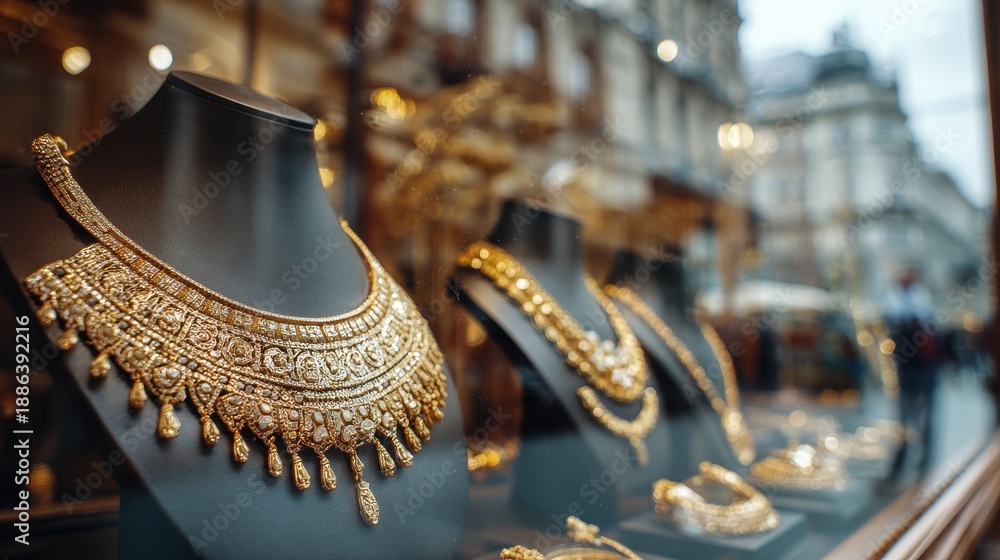 Jewelry displayed in a shop window in a busy street in a city during the day with people walking by #1886392216