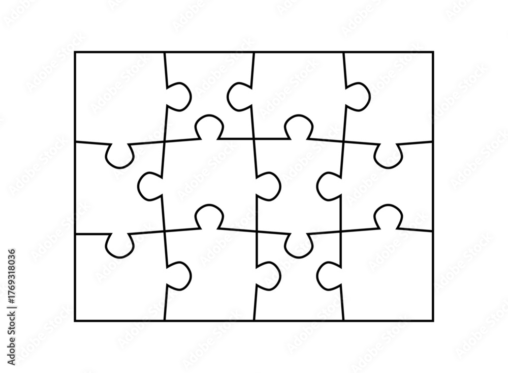 Jigsaw puzzle pieces blank template. Cutting lines simple grid design for kids jigsaw rectangle puzzle - 12 pieces. #1769318036