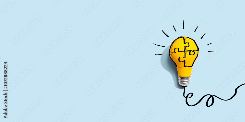 Jigsaw puzzle with a yellow light bulb - Flat lay #1072888224