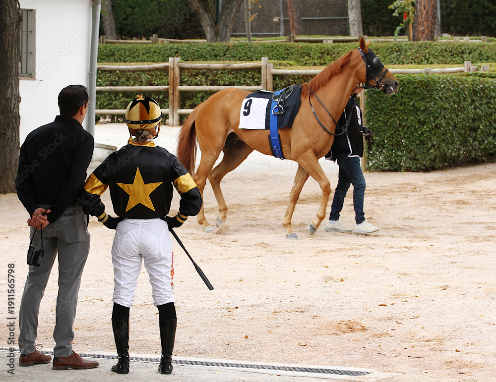 Jockey, caballo y preparador en ensilladero de hipódromo antes de la carrera #1911565798