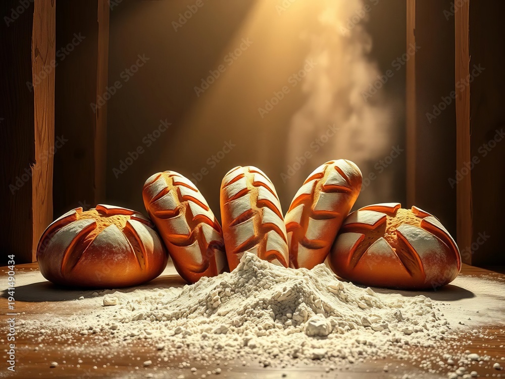 Joyful artisan, golden loaves bloom, flour dusts geometric stage, bread, flat lay #1941490434