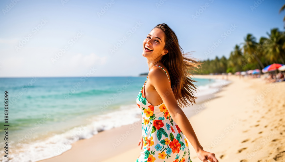 Joyful Beach Bliss: A radiant young woman with flowing hair, dressed in a vibrant floral sundress, exuding happiness as she strolls along a sun-kissed beach, ocean sparkling in the background. #1903005099